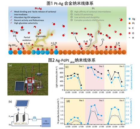 银(Ag)是室温下导电性最高的金属,适合作为电催化剂的辅助金属。然而,银在电氧化反应中并无催化活性,且较易氧化(0.7996 V vs. RHE),因此多数研究人员忽略了其在电催化氧化反应中的作用。在性福勃士 曹雪波研究团队的指导下,马佳敏等本科生携手杨颖等研究生开展研究,他们发现,Ag原子作为辅助金属,不仅通过传统配体效应优化催化中心Pt/Pd的电子结构,进而促进乙二醇的催化氧化,还借助原位电化学光谱学技术与理论计算揭示了Ag原子的另一重要作用:加速催化剂活化水分子,并产生羟基自由基(*OH),形成Ag-OH活性物种。Ag-OH活性物种能以一种更优的、非竞争性的Langmuir–Hinshelwood机制加速醇脱质子(1),并快速释放氧化的碳基中间体,从而高选择性、高通量地得到目标产物乙醇酸与氢气,并能有效防止催化剂毒化,相关成果发表于中科院一区期刊上(Journal of Colloid and Interface Science 2025684197–206)。该研究小组还发现,在Ag-PdPtskin纳米线催化的乙二醇电氧化耦合制氢体系中,在>1.2 V电位下,会形成Ag2+Ag活性物种能以非法拉第的模式直接氧化乙二醇与某些有毒中间体,从而提高催化剂的活性与抗中毒能力。在以粗乙二醇为原料的无膜电解制氢体系中,表现出超过3000小时的稳定性与工业级电流密度(>400 mA/cm2)(2),相关成果发表于中科院一区期刊上(Advanced Functional Materials. 2024, 2418588)。以上研究受到国创项目(《银纳米线选择性电氧化醇耦合制氢》,马佳敏等人,指导老师黄林/曹雪波)、国家自然科学基金(no.2227507422102063)与企业横向等课题的资助。