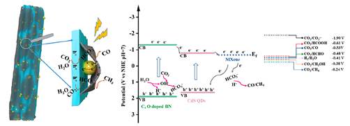 Mxene/CdS QDs/BN材料中BN具有丰富的微孔结构,有效提高了其对CO2 的吸附,CdS QDs对可见光有较好的吸收,三种组分之间良好的能级匹配实现了高效的电荷转移(图1),Mxene的包覆可以缓解CdS的光腐蚀。作为气固相反应催化剂,100MX/CQ/BN样品在光照下可以高效地实现CO2转化, COCH4产率分别为2.45 0.44μmolg-1h-1
