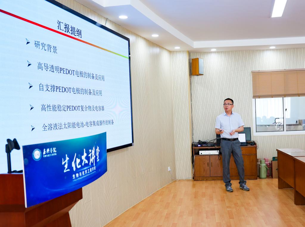 李在房教授作题为《高导PEDOT电极的制备及在光电器件和能源器件上的应用》的报告。报告指出,导电聚合物PEDOT:PSS具有可水溶液加工、高透光率、高电导率、功函数可调、良好的柔韧性及空气稳定性等优点,已成为当前研究及应用热点。报告人聚焦高导PEDOT:PSS电极的制备和导电机制研究,展示其在有机太阳能电池、超级电容器、有机热电及电池-电容组合器件等领域的多功能应用。