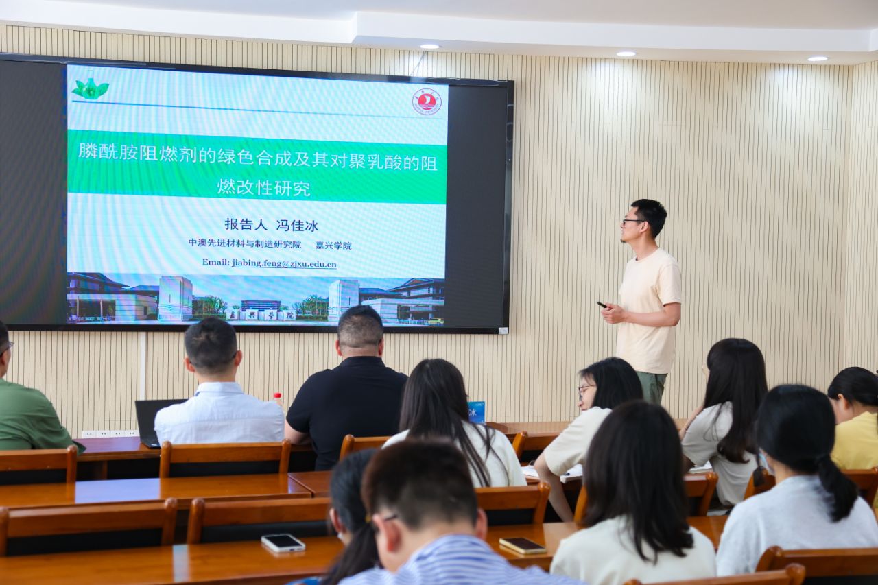 冯佳冰博士作题为《膦酰胺阻燃剂的绿色合成及其应用于聚乳酸阻燃改性》的报告。报告指出,膦酰胺对聚乳酸(PLA)材料具有极高的阻燃效率,是一种极具潜力的新型高性能环保阻燃剂,但该类阻燃剂在合成方法上均需使用大量有毒有机溶剂。为解决以上问题,报告人聚焦大分子型甲基膦酰胺阻燃剂的无溶剂合成,并探讨其对PLA树脂的阻燃改性。