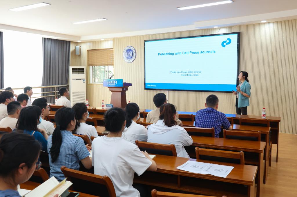 廖凤麟博士首先介绍了细胞出版社Cell Press)旗下Chem、 Matter、Joule等旗舰期刊的基本情况,并对iScience的创刊目的、定位、年发文量、收稿范围、未来趋势等进行了详细介绍。随后重点就编辑视角下的同行评议过程作详细说明,同时对如何写好科技性论文特别是论文的摘要、前言和结论部分的写作技巧与方法进行了针对性辅导。报告结束后,在场师生就论文写作和论文投稿等关心的问题踊跃提问,廖凤麟博士耐心地解答了师生们提出的问题,现场气氛热烈。