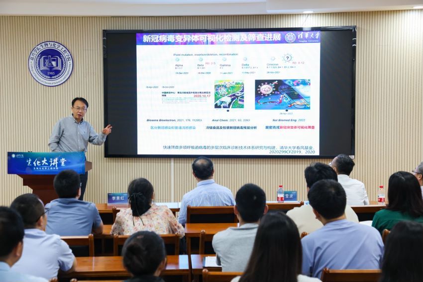 李景虹院士首先从“生物分子的化学测量学旨在揭示复杂生命体系的分子信息”这一概念着手,强调了在应对重大突发公共卫生事件的过程中,化学测量学发挥着关键作用,但同时也面临着更高的准确性、更快速简便、更高的检测通量等需求和挑战。随后,李景虹院士重点介绍了其领衔的课题组近年来在“非典”疫情、新冠肺炎疫情、猴痘疫情等烈性传染病的疫情防控科研工作中所取得的一系列重大成就,如发展了“非典”病毒抗原双标记免疫层析检测技术、开发了新冠病毒单碱基分辨核酸快速检测技术与仪器、发现了猴痘病毒基因的核酸二级结构进化特征等,为国家重大突发公共卫生事件的疫情防控做出了积极贡献。李景虹院士强调指出,复杂生命体系的化学测量学的发展,将极大促进病原体检测、病原体致病性研究、药物筛选与疫苗研发,在保护人民生命健康上发挥至关重要的作用。在最后互动交流环节,李景虹院士耐心地解答了师生们提出的问题,现场气氛热烈。