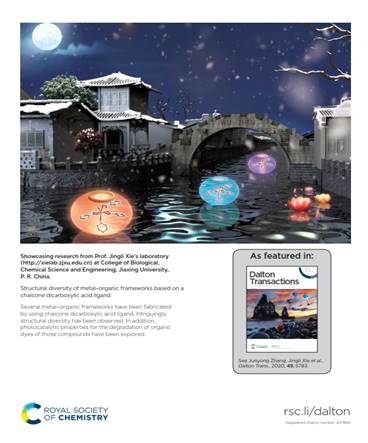 课题组以2,6-(4-羧基苯亚甲基)环己酮为配体,选用若干过渡金属合成一系列具有结构新颖性的金属-有机框架材料,该结果发表在道尔顿汇刊(Dalton Transactions, 2020, 49: 5783-5786)并被选为封底文章。金属-有机框架材料以其丰富多变的结构特征、广泛的用途得到化学工作者的持续关注。