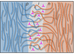 图1. 体p-i-n结构的形貌示意图:其中蓝色和橙色链分别代表给体和受体聚合物链,形成p型和n型晶体纤维相(蓝色和橙色区域),紫色结构代表第三组分