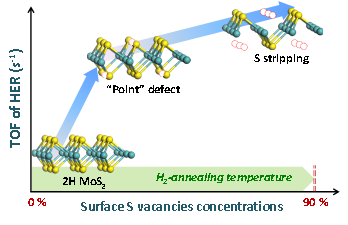 全文概要:MoS2是一种性能优良的电催化分解水析氢反应(HER)催化剂。虽然前期文献报道了硫空位可促进HER在酸性电解液的催化活性,但是对于硫空位在碱性电解液中对HER催化活性影响还未知。现有文献仅仅停留在低浓度(15%)“点状”硫空位的报道,对于高浓度硫空位以及随之形成的不饱和配位Mo的影响还是未知。本论文采用氢刻蚀技术,制备了高浓度(约90%,表面硫空位浓度)硫空位的二维多层MoS2,远远突破已报道的硫空位浓度(约15%)。结合系统表征,并深入分析讨论其电催化分解水析氢反应(HER)活性转化频率(TOF)等电催化性能参数与表面硫空位的定量关系。结果发现,在酸性(pH=0)和碱性(pH=13)条件下,表面硫空位对HER性能影响均可分为两个阶段:(1)表面硫空位迅速提升HER性能区域:低浓度 “点状”硫空位缺陷(表面硫空位:0-15%,S:Mo > 1.7);(2)表面硫空位缓慢提升HER性能区域:硫原子剥除引起的高浓度硫空位缺陷(表面硫空位:15-90%,S:Mo < 1.7)并随之形成的不饱和配位Mo区域。排除晶相影响,表面硫空位浓度越大,导致越好的HER活性。证实了“缺陷催化”的概念,故“Defect is perfect!”(缺陷也是完美)。
