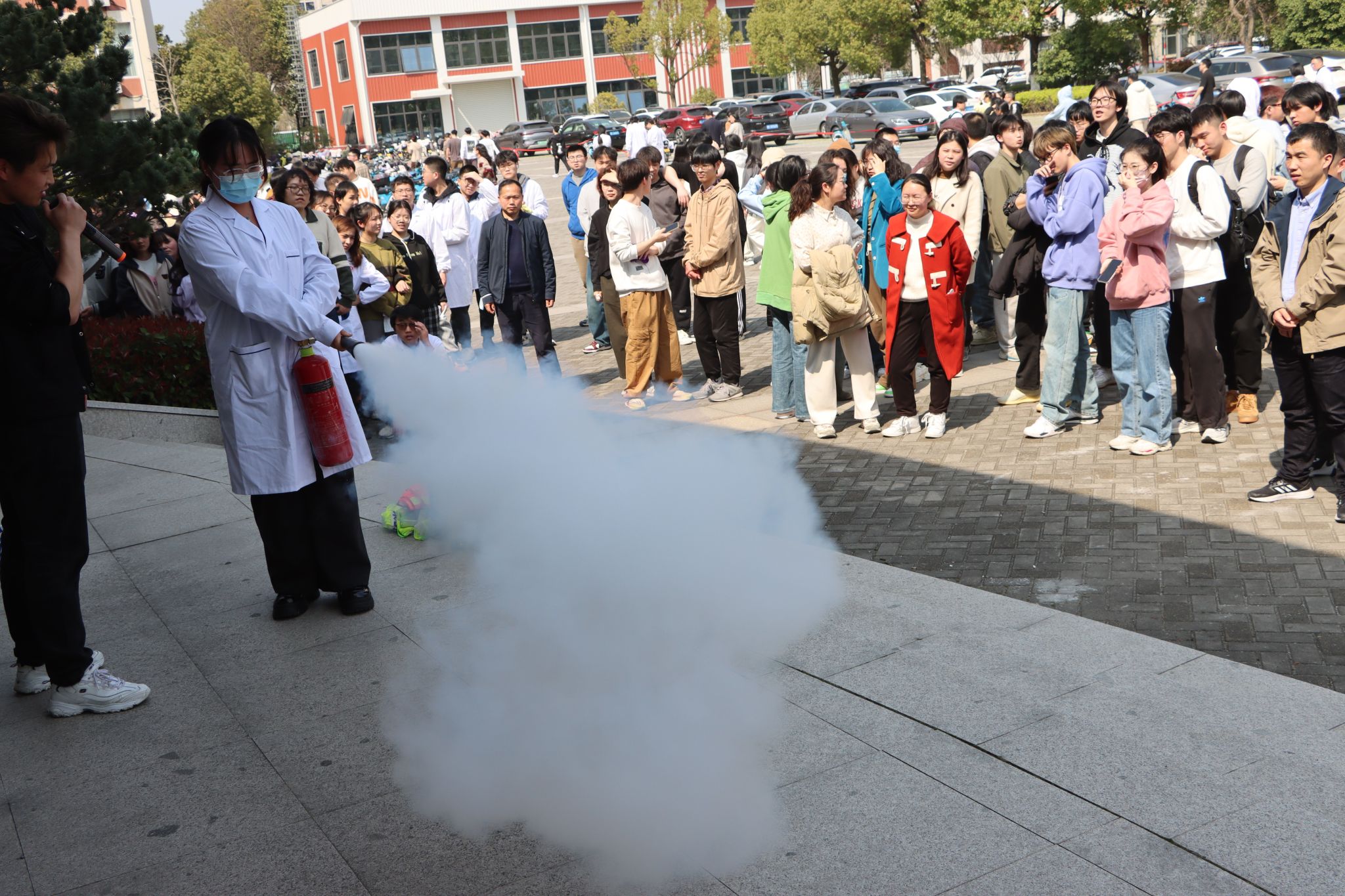 学校保卫处消防管理科丁伟老师对此次疏散演练活动进行了点评,他表示全体师生第一时间安全有序全部撤离到安全区域,说明此次火灾逃生演练活动比较成功,达到了预期效果。丁伟在现场示范了灭火器等消防器材的正确使用方法,参加演练的部分师生进行了实践操作。