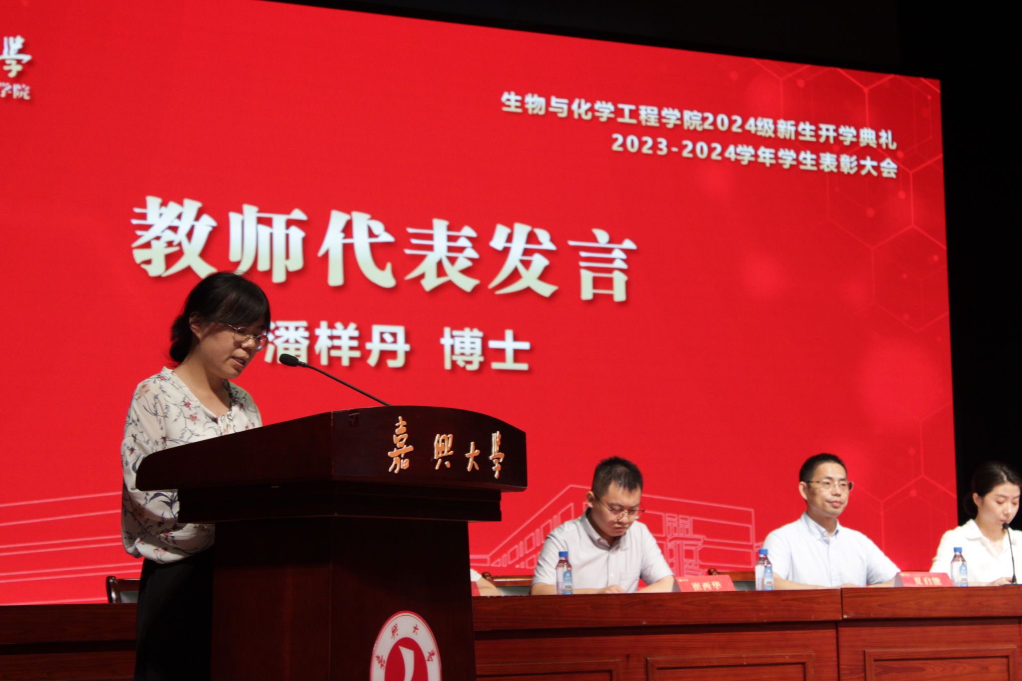潘样丹老师作为教师代表寄语新生,要设立明确的目标,要积极参与校园活动,注重身心健康,培养良好的学习习惯和时间管理能力。
