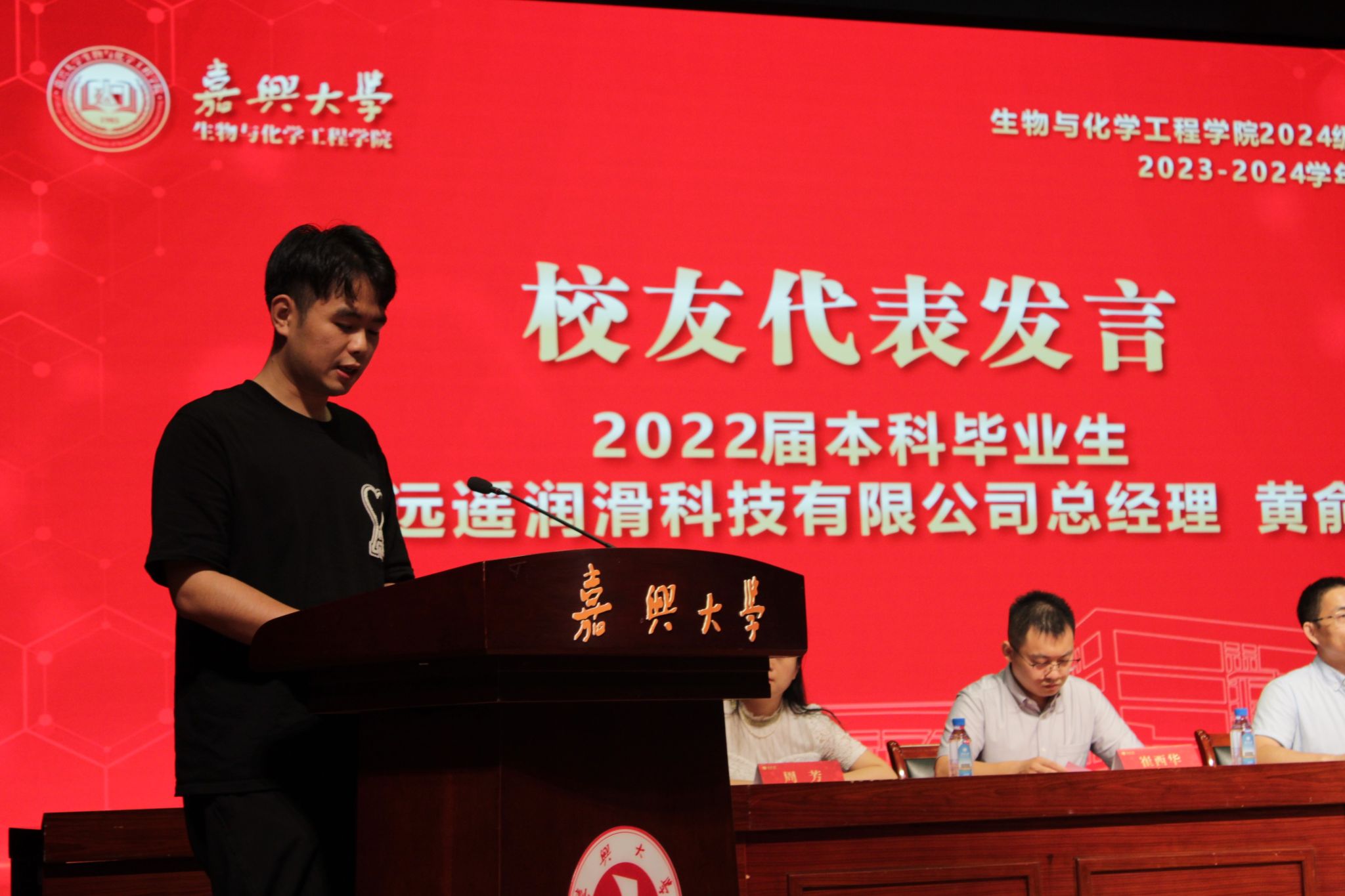 2022届化工专业校友、浙江远遥润滑科技有限公司总经理黄俞杰作为校友代表发言。他回顾了自己在母校的求学之路,以亲身经历告诉同学们,要尽早确立目标、尽力完善自我、保持身心健康、享受大学生活。