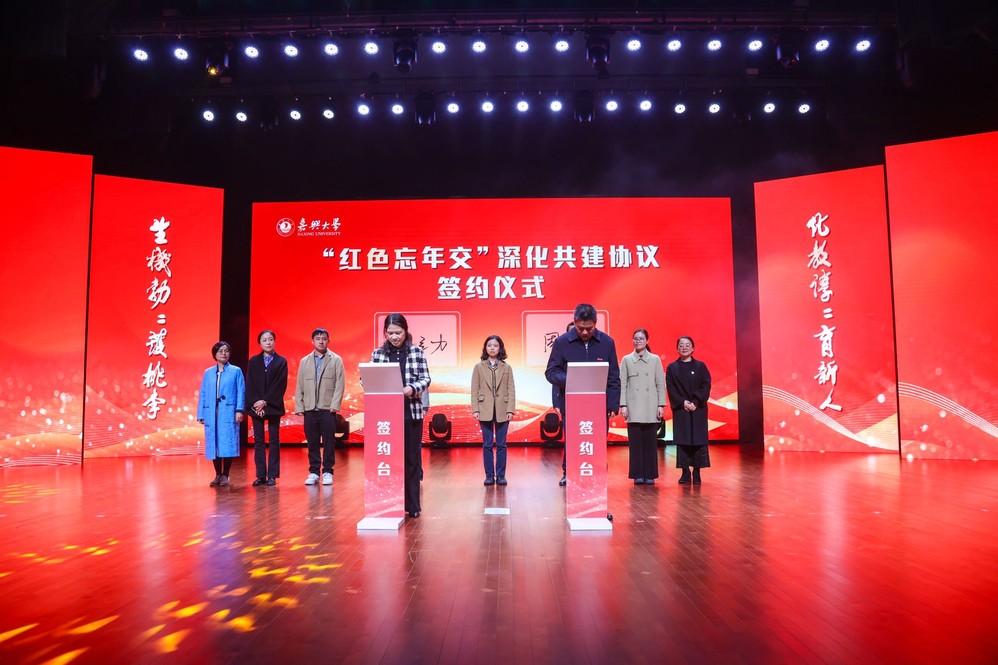 会上,陈立力与周军代表校会双方签订了“红色忘年交”深化共建协议;生化学院党委负责人为嘉兴市新四军历史研究会宣讲团的老同志颁发了校外辅导员聘书;张红宇为性福勃士