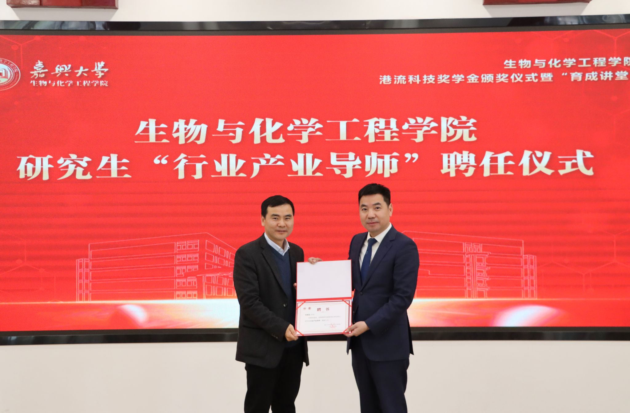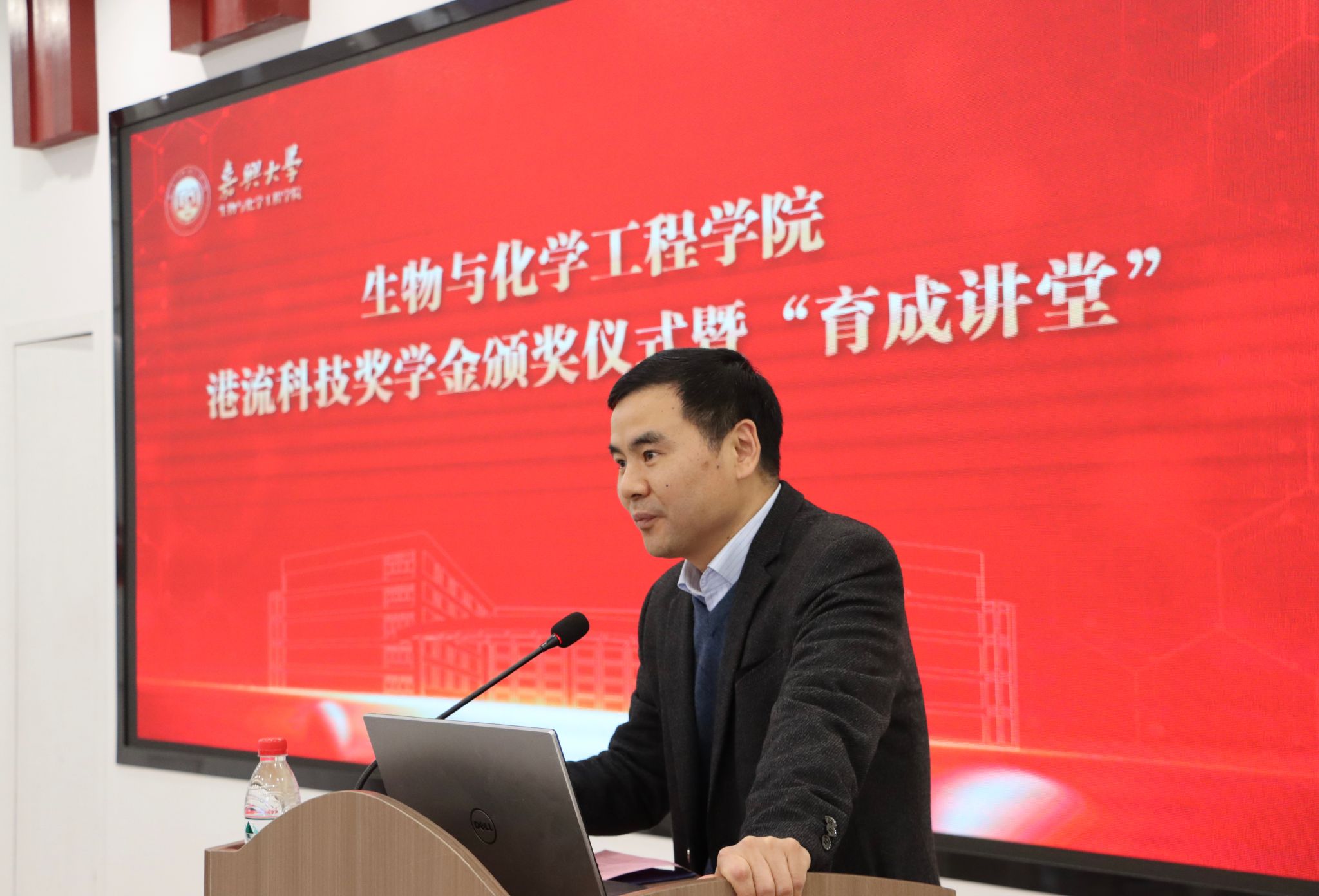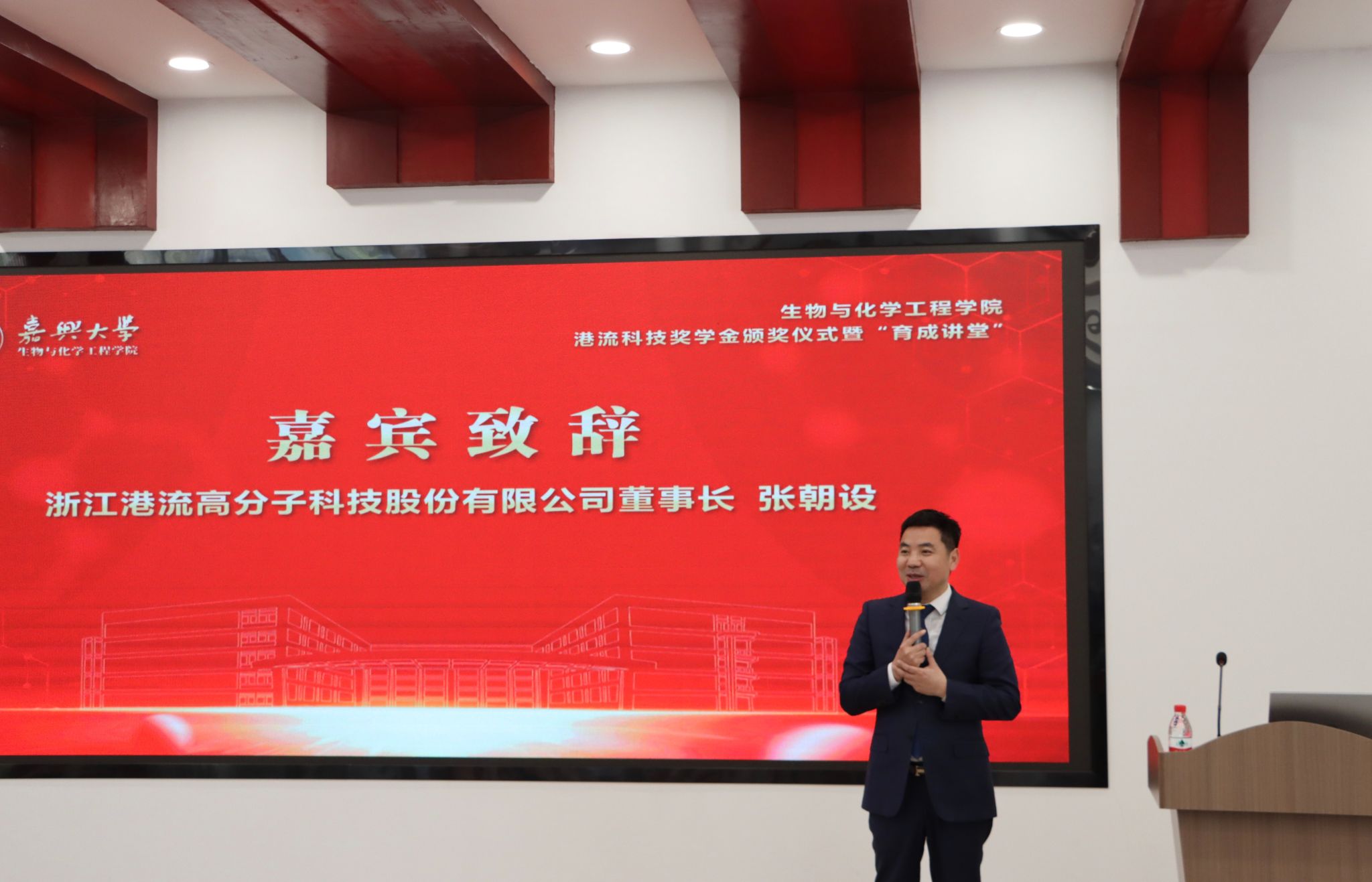 育成讲堂在仁心楼报告厅举行。浙江港流高分子科技股份有限公司董事长张朝设、综合管理部经理方芹,生化学院院长曹雪波、党委书记任玉萍、党委副书记黄艺等嘉宾及百余名师生代表参加颁奖仪式,见证校企协同育人的重要时刻。